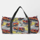 A grey duffle bag is covered in a vibrant pattern of red fire trucks, complete with ladders and fire axes, set against a light-coloured ground with yellow splashes. A prominent side pocket, adorned with a red fire department emblem, proudly displays "FIRE RESCUE," "JENNY SAMSMITH," "FIRE DEPARTMENT," and "Vancouver B.C.," creating a personalised and functional item for a firefighter. Personalise with your name and department home town and more. monogram