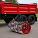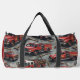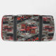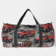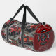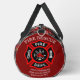 This duffle bag boasts a dynamic pattern featuring an array of red fire trucks with yellow stripes, alongside scattered fire axes. The realistic illustrations are set against a muted background that combines shades of grey and hints of yellow, creating an immersive scene. This design is perfect for those who admire the brave work of firefighters and emergency services. A prominent side pocket, adorned with a red fire department emblem, proudly displays "FIRE RESCUE," "JENNY SAMSMITH," "FIRE DEPARTMENT," and "Vancouver B.C.," creating a personalised and functional item for a firefighter. Personalise with your name and department home town and more. monogram
