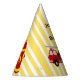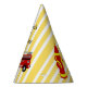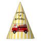 Fire truck birthday party personalised party hat, this design has a firetruck illustration in retro style in red and yellow stripes background.