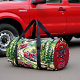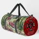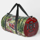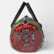 This duffle bag features a captivating pattern of red fire trucks navigating a winding road through a lush green forest. The vibrant scenery with tall pine trees and a subtle mountain backdrop creates an adventurous feel. A prominent side pocket with a fire department emblem is personalised with "FIRE RESCUE," "JENNY SAMSMITH," and "Vancouver B.C.," making it a unique gift for a firefighter. Personalise with your name and department home town and more. monogram