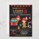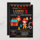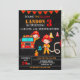 Cute invitation for young firefighter's birthday party featuring Red Fire truck, brown haired firefighter boys and some fire fighting equipment.