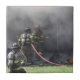 A ceramic tile featuring a photo of firefighter battling a house fire.