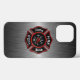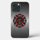 Fire Department red logo badge on brushed metal looking texture print background. Great for firemen and first respondents.