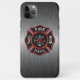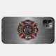Fire Department red logo badge on brushed metal looking texture print background. Great for firemen and first respondents.