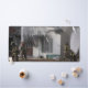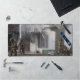 A desk mat featuring a photo of firefighters battling a house fire.