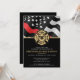 This design features a firemen's flag with black and white stripes, and a thin red line stripe waving in the wind. A fireman's badge sits above all of the party details for the graduating firefighter.