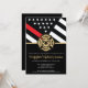 This design features a firemen's flag with black and white stripes, and a thin red line stripe as well. A fireman's badge sits above all of the party details for the graduating firefighter.