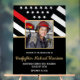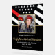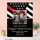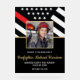 This design features a firemen's flag with black and white stripes, and a thin red line stripe as well. A fireman's badge sits above all of the party details for the graduating firefighter, which is next to a picture of the new fire academy graduate.