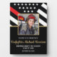 This design features a firemen's flag with black and white stripes, and a thin red line stripe as well. A fireman's badge sits above all of the party details for the graduating firefighter, which is next to a picture of the new fire academy graduate.
