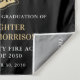This design features a firemen's flag with black and white stripes, and a thin red line stripe as well. "Congratulations" and a fireman's badge sits above the name of the graduating firefighter. Celebrate in style!