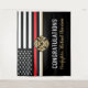 This design features a firemen's flag with black and white stripes, and a thin red line stripe as well. "Congratulations" and a fireman's badge sits above the name of the graduating firefighter. This design also works great for retiring firefighters, lieutenants, or chiefs. Celebrate in style!
