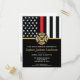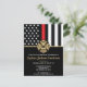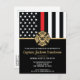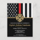 This design features a firemen's flag with black and white stripes, and a thin red line stripe as well. A fireman's badge sits above all of the party details for the retiring firefighter, lieutenant, or chief's retirement party.