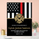 This design features a firemen's flag with black and white stripes, and a thin red line stripe as well. A fireman's badge sits above all of the party details for the retiring firefighter, lieutenant, or chief's retirement party.