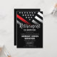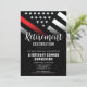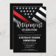 This design features a firefighter flag with black and white stripes, and a thin red line stripe as well. "Retirement Celebration" sits above all of the party details for the retiring firefighter, lieutenant, or chief's retirement celebration.