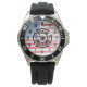 Has heft and feel of expensive stainless steel quartz wrist watches. Solid construction and good looks. Although it had a really top quality rubber strap, I substituted a stainless steel "Shark" style mesh strap, which I think is the most comfortable strap available. Perfect. True colors of original image. Clear, crisp image precisely aligned and spaced.