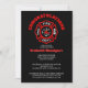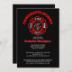 Firefighter graduation announcement party invitations in red, black and white- Reads 'Congratulations' in bright red, curved lettering at the top. Below is the classic firefighting logo, the Maltese cross, in black, white, and red with firefighter icons such as ladder, helmet, hydrant, axe, etc, and reads 'Fire Dept'. On black background. Personalised with graduate's name in matching red lettering with drop shadow effect. Custom graduation party information, including RSVP details, printed in white, classic lettering. Simply fill in your own firefighter graduation party details with the easy to use text template. Back has matching black background. Feel free to change the background to any colour. We have firefighter theme graduation gifts, too, in our Zazzle.com/angela65* shop.
