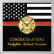 This design features a firemen's flag with black and white stripes, and a thin red line stripe as well. "Congratulations" and a fireman's badge sits above the name of the graduating firefighter. This design also works great for retiring firefighters, lieutenants, or chiefs. Celebrate in style!