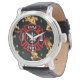 Maltese cross watch for firefighters and other emergency responders- Red, black, and white Maltese Cross shield against a black background with photo of fiery flames and fire. White clock face numbers. Awesome birthday gift for firemen or gift for graduation. Nice Father's Day gift as well as retirement gift for fire chief, too!