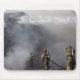 A mouse pad featuring a photo of firefighters battling a house fire.