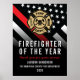 Celebrate exceptional dedication and bravery with this striking Firefighter of the Year design. It features a bold firefighter flag with classic black-and-white stripes and a powerful thin red line to honor courage and sacrifice. This poster makes a meaningful way to recognize a firefighter, lieutenant, captain, or chief for outstanding service, commitment, and leadership. A distinguished keepsake to highlight their hard work, honor their achievements, and show appreciation for the impact they make in their community.