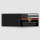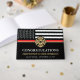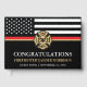 This design features a firemen's flag with black and white stripes, and a thin red line stripe as well. "Congratulations" and a fireman's badge sits above the name of the graduating firefighter. This design also works great for retiring firefighters, lieutenants, or chiefs. Celebrate in style!