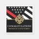 This design features a firemen's flag with black and white stripes, and a thin red line stripe as well. "Congratulations" and a fireman's badge sits above the name of the graduating firefighter. This design also works great for retiring firefighters, lieutenants, or chiefs. Celebrate in style!