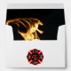 Unique firefighter 5x7 invitation envelope lined with photo of fire and flames. At the bottom on the back is the fireman's Maltese Cross shield in red and black and reads 'Fire Dept' with ladder, axe, hydrant, and other firefighting symbols. Perfect fire theme envelopes for firefighter's birthday, bonfire party, firefighter retirement, or kids firefighter theme birthday. We have matching bonfire party invitations in our Zazzle.com/angela65* shop, as well as firefighting theme gifts.