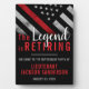 This design features a firemens flag with black and white stripes, and a thin red line stripe as well. "The Legend is Retiring" text sits above all of the party details for the retiring firefighter, lieutenant, or chief.