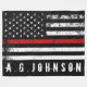 A custom name distressed style Fire fighter flag fleece blanket. The thin red line running across the entire fleece is representative of American Fire fighters and fire rescue. Follow the directions in the sidebar to add a name and to have it look perfect underneath the flag.