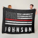 A custom name distressed style firefighter styled American flag fleece blanket. The thin red line running across the centre is representative of firefighter professionals. Follow the directions in the sidebar to add your name and to have it look perfect underneath the flag.