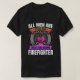 A firefighter proudly displays a unique t-shirt emphasizing equality and the special role of firefighters. The vibrant design includes striking colours and bold text, creating an inspiring message against a neutral backdrop.