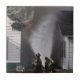 A ceramic tile featuring a photo of firefighters battling a house fire.