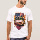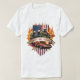 This custom t shirt features Four firefighters in full gear stand in front of an American flag with flames surrounding them, holding a hose towards a burning car. symbolising bravery and heroism,