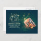 Special and unique save the date postcard with beautiful whimsical mason jar with glowing lights - fireflies - lightning bugs. Modern yet vintage save the date perfect for rustic country wedding themes.