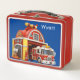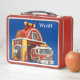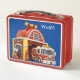 This cool lunch box with a firehouse and Engine truck can be personalised with your little firefighter name