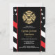 This design features a firemen's flag with black and white stripes, and a thin red line stripe as well. A fireman's badge sits above all of the party details for the retiring firefighter, lieutenant, or chief's retirement party.