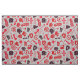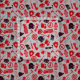 Fireman theme pattern with Fire Truck, Axe, hydrants, fire hose and other related symbols and tools in red and black over a light grey background.