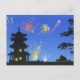 Illustration of firework display and silhouette of pagoda and trees. Copyright: William Donahue