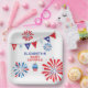4th of July baby shower paper plates. Little Firecracker Patriotic Baby Shower party supplies in red, white and blue and fireworks with patriotic cupcake accent.