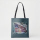 This American, flag image, is highlighted against, fireworks bursting, in a colourful display of, red, white, blue, and yellow, flares-in a cloudy, twilight sky, of slate-blue.