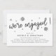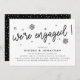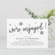 Modern black and white engagement party invitations feature "we're engaged!" in black handwritten style script lettering surrounded by bursting fireworks and hand drawn stars. Personalise with your engagement party details beneath in modern black lettering.