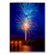 Photograph of fireworks taken at dusk and at the moment of explosion, forming a very bright image that lights up the river water.