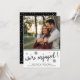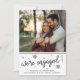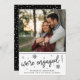 Modern black and white engagement announcement or save the date features "we're engaged!" in black handwritten style script lettering surrounded by bursting fireworks and hand drawn stars. Personalise with your names and save the date details (wedding date and location) or any additional info beneath. Add your favourite engagement photo to this modern yet cheerful design.