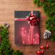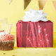 A sheet of wrapping paper featuring a photo of red rocket like fireworks.