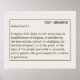 Text: Amendment I Congress shall make no law respecting an establishment of religion, or prohibiting the free exercise thereof; or abridging the freedom of speech, or of the press; or the right of the people peaceably to assemble, and to petition the government for a redress of grievances. Design description: text of the First Amendment of the United States Constitution, framed in a black and white rectangle. Customizable background color and font.