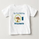 A cute baby t-shirt which says: "My First Birthday" Personalise with Name. A cute baby safari monkey holding a pacifier in his mouth inside a circle with an olive green border.