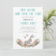 A cute first birthday invitation for a little girl, perfect for spring. The top features the phrase "hop along and join the fun!" in brush lettered font, and the bottom of the invitation has a beautiful illustration of a bough of wild flowers, with a rabbit sat in the middle, and flying bees. The reverse side has a block light teal backing.