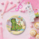 Grinning green dinosaur is celebrating your child's first birthday! Personalise and add your baby's name. Matching birthday party items are available!