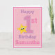 A pink number one decorated with light pink polka dots. A cute happy yellow star with big blue eyes. Below is a text template to add the birthday girls name.
