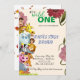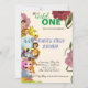 The wild one- cute wild animal crafted first birthday inviation card. light pink colour backgroung with some flower boder one side other side wild animal cartton looks so beautiful invitation card.